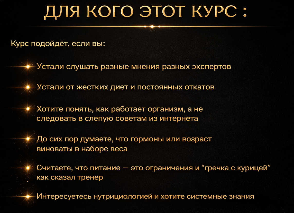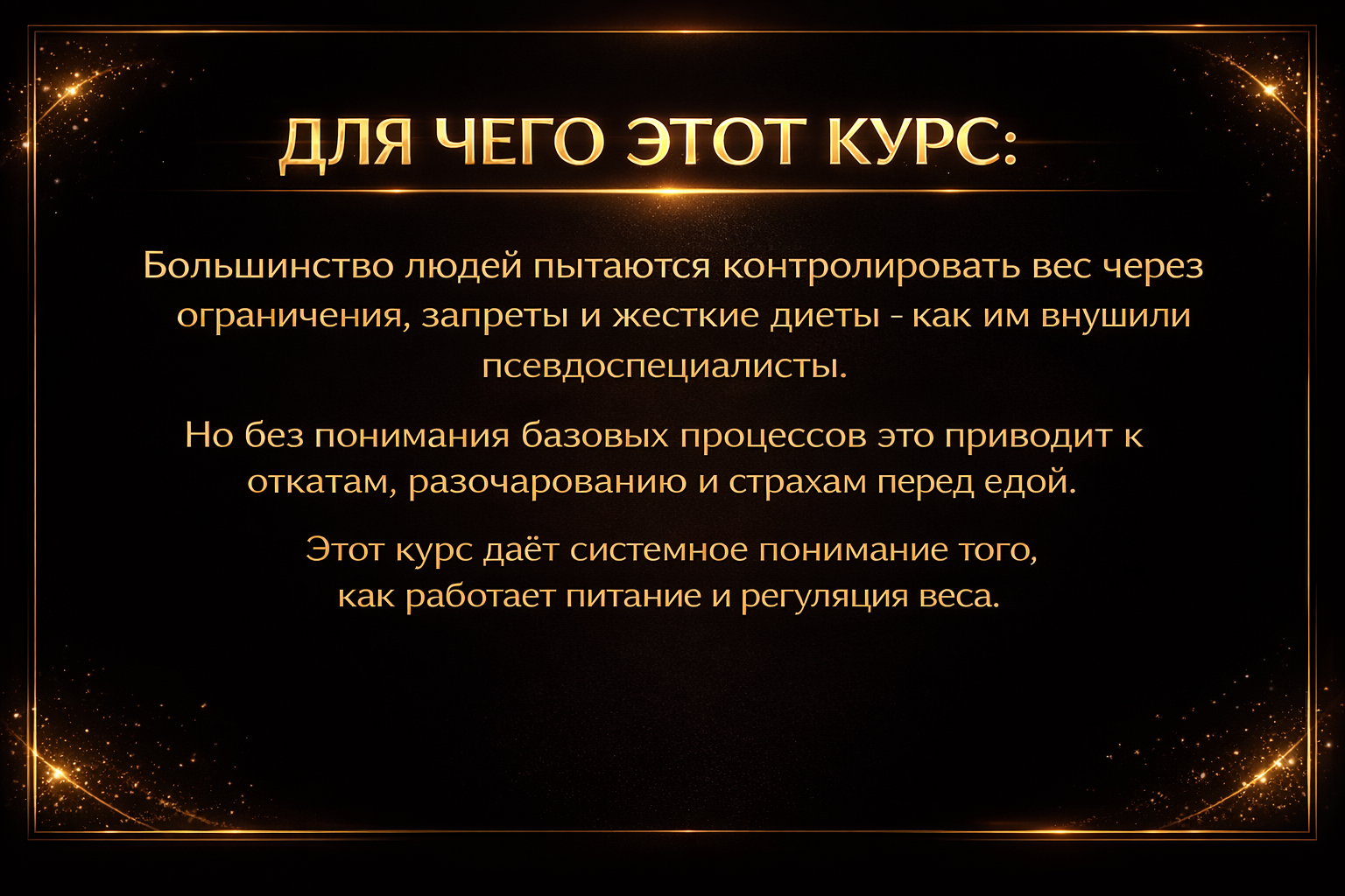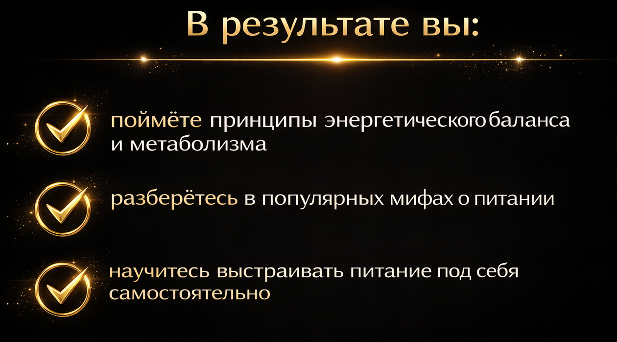Материалы курса не содержат персональных или конкретных планов питания (это невозможно в рамках онлайн курса), и не заменяют консультации специалистов.